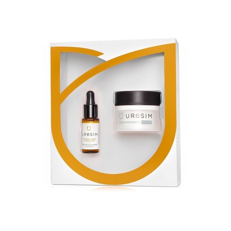 Tratamiento especifico para las manchas, indicado para todo tipo de piel. Uresim combina el concentrado Iluminador de proteoilicanos y vitamina C con la crema Depigmentant Noche. Corrige la apariencia de las manchas, Ilumina el rostro y disminuye las líneas de expresión. Actúa profundamente bloqueando la síntesis excesiva de melanina y eliminando los depósitos de melanina preexistentes.