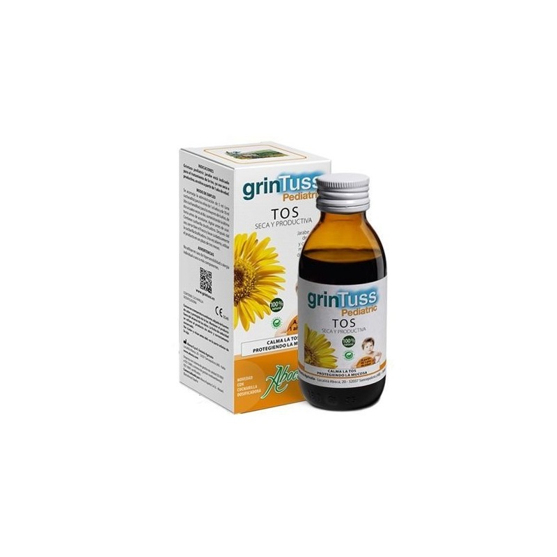 GrinTuss pediatric jarabe está indicado para el tratamiento de la tos, ya sea seca o productiva, de niños a partir de 1 año de edad. Es un producto sanitario 100% natural a base de Poliresin y Miel que actúa calmando la irritación, protegiendo la mucosa y favoreciendo la hidratación y eliminación del moco.