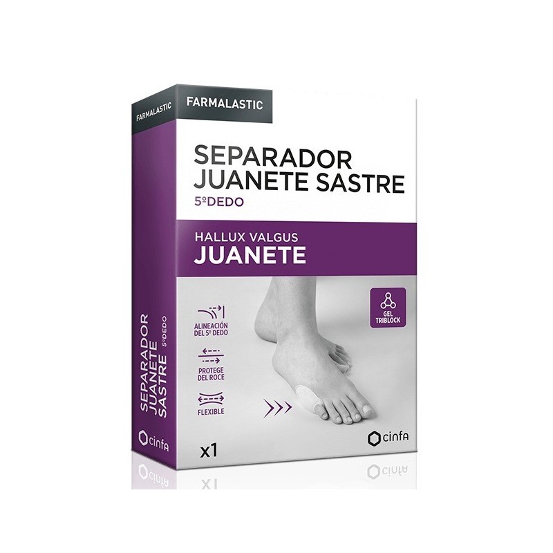 El Separador de Juanete de Sastre (5º dedo), para adultos, está indicado para personas que tienen juanete de sastre. Ayuda a alinear el quinto dedo del pie evitando una superposición sobres los dedos contiguos. Ayuda a aliviar el dolor provocado por el roce del calzado (fricción excesiva) El Separador de Juanete de Sastre (5º dedo) de Gel Triblock está diseñado ergonómicamente para adaptarse al quinto dedo del pie con facilidad. El gel es multidireccional, suave y flexible, eliminando la fricción con el calzado al caminar. Cuenta con memoria de recuperación, vuelve a su forma inicial tras su uso. El gel lateral protege el juanete de sastre del exceso de fricción. Se puede reutilizar. Apto para utilizar calcetines.
