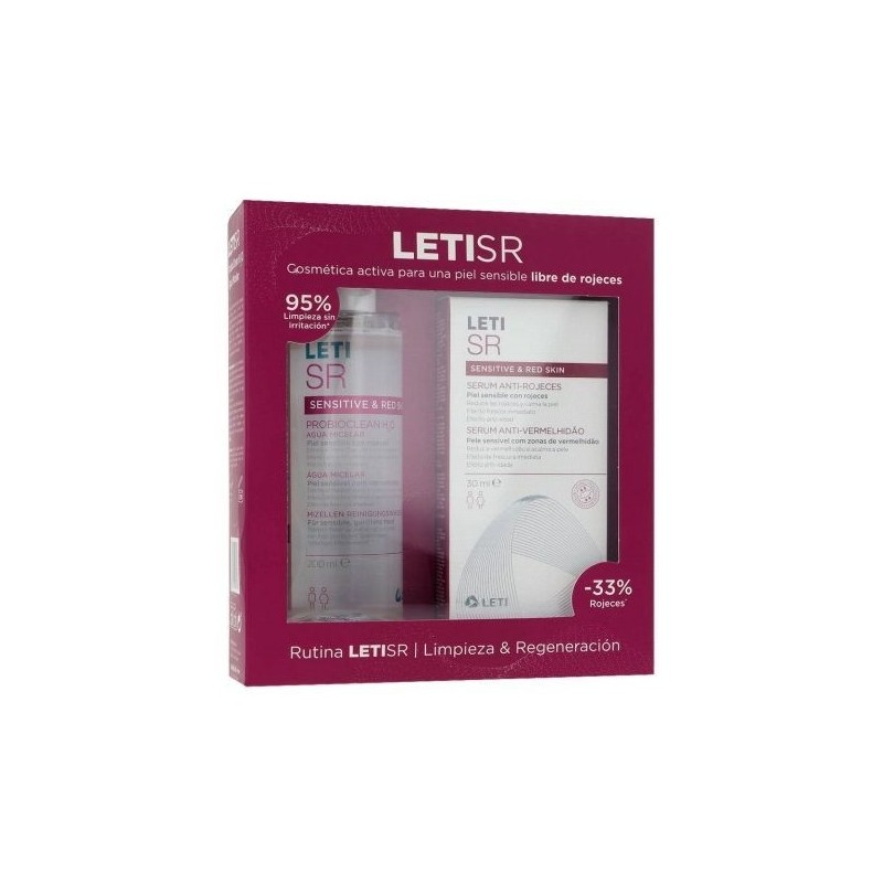 Este pack con precio especial es ideal para personas que buscan tratar con delicadeza la sensible con rojeces, es el dúo perfecto de higiene y reparación para las pieles dañadas, así mismo, disminuye y elimina la sensación de incomodidad. Leti sr probioclean h²o 200 ml: agua micelar que limpia en profundidad cara y ojos. Tiene un un alto poder de arrastre sin irritar, aporta una sensación de frescor inmediato y un efecto calmante. Leti sr sérum anti-rojeces 30 ml: fórmula concentrada y con activos ultra-reparadores. Redensificador cutáneo con fecto anti-edad, ideal para el cuidado diario de la piel sensible con rojeces.